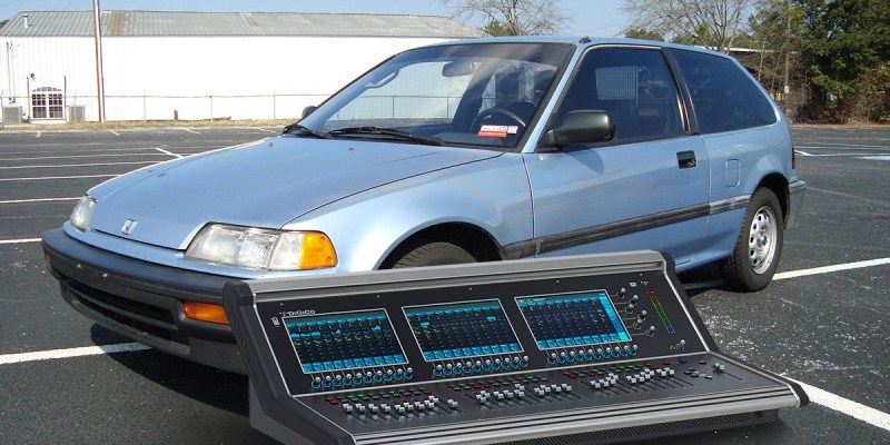 The mixing console, which Hafner purchased for $8,600.95, is ultimately too large and unwieldy to fit inside the early model, economy-class Civic, which Kelley Blue Book currently lists at a value of $650 to $873.