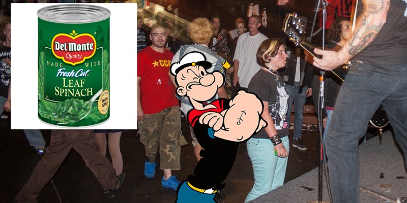 “Dude, it was like everyone was monitoring a ticking time bomb, I swear. The only thing between all of us surviving in the pit that night was Popeye not catching a glimpse of that lone can of Del Monte lingering over by the merch table,” said apprehensive audience member Ernest “Pollywog” Polinzski. “The show being a vegan potluck didn’t help things either, to tell you the truth. He could’ve taken a bite of anything and the band would’ve had to lurch into a rousing instrumental rendition of ‘Be Kind To Your Webbed-Footed Friends’ and we would have been punching bags for the next hour, whether we identified as ‘palookas’ or not!”