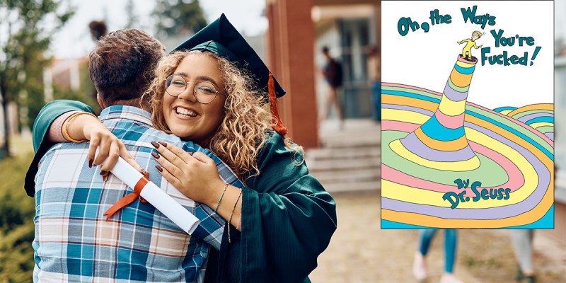 NEW YORK — Random House Children’s Books official reissue of the long-dismissed 1991 Dr. Seuss manuscript “Oh, The Ways You’re Fucked!” is quickly becoming the go-to gift for graduating seniors bracing for life in the rent-gouged, atmosphere boiling, politically divided, AI fueled nightmare world of adults, confirmed sources.