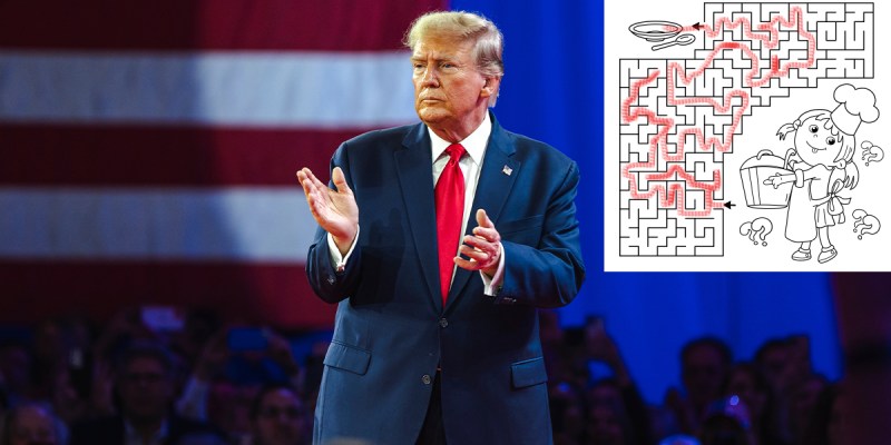 “I’m sitting there, in front of me the most beautiful moons over my hammy you’ve ever seen. But I said, I’m not eating until these words are unjumbled,” Trump explained. “They have a picture, it’s a cow, and it says ‘what sound does a cow make?’ Moo, and I got it right away. It was unbelievable. The waitress, really thick woman, said no one had done that before. She was stunned. Even the line cook, who was very busy, by the way, stopped what he was doing. And he came over to shake my hand, with tears in his eyes, and said ‘I want to personally thank you for leading the Grand Slams through the maze to Breakfast Island.”