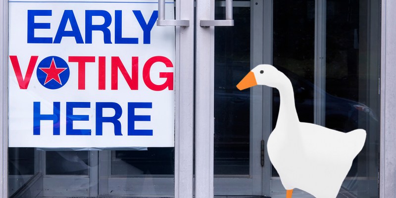 The avian culprit was the cause of several hijinks at the voting site, such as stealing pens from every booth and scattering voter rolls across the floor. The goose was also able to cut through a loose wire with its beak, shutting down the site’s sole vote counting machine before rogue Republican poll workers could.