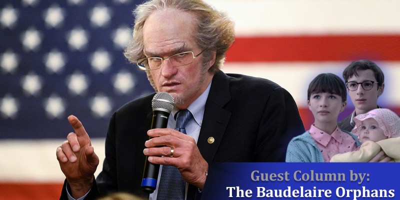 My name is Klaus Baudelaire and with me are my sisters, Violet and Sunny. For the past year, our lives have been made miserable by a dastardly man named Count Olaf. In an attempt to steal our family fortune, he has assumed various identities from a herpetologist’s assistant to a peg-legged ship captain. And now, he is deceiving you all by disguising himself as a democratic candidate in the 2020 election with the fake name of “Bernie Sanders” in order to steal the inheritance owed to me and my family.