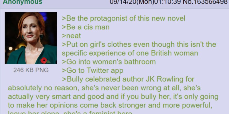 LONDON — Best-selling author JK Rowling announced today that her new novel Troubled Blood will be published anonymously, written entirely in a greentext story on 4chan.