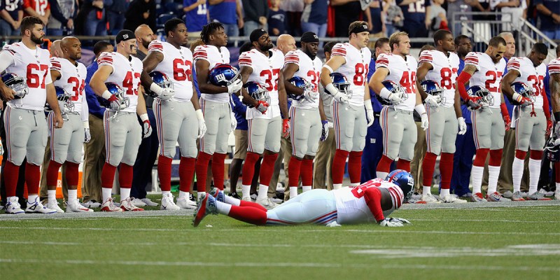 EAST RUTHERFORD, N.J. — In what appeared to be an attempt to show support for his teammates, New York Giants rookie running back Aaron Brockfeld mistakenly laid flat on the ground during the national anthem before today’s game against the Los Angeles Rams.