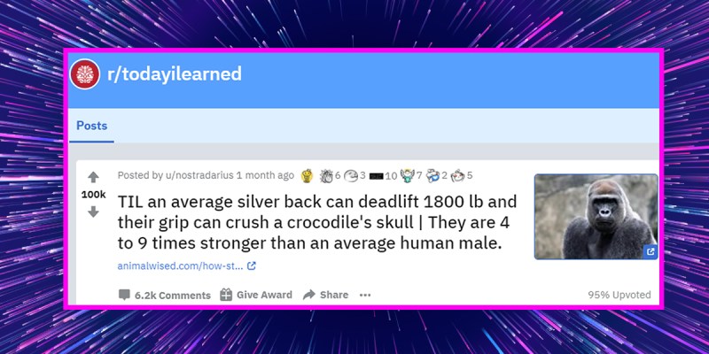 — u/detten17’s comment on the thread, “TIL an average silver back can deadlift 1800 lb and their grip can crush a crocodile’s skull | They are 4 to 9 times stronger than an average human male.”