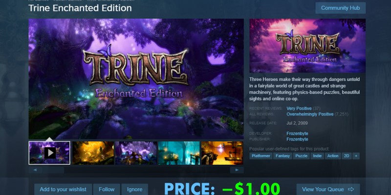Popular software distribution platform Steam has announced one of its most innovative flash sales to date. This weekend only, users will receive one American dollar in exchange for downloading the 2009 medieval puzzle platform game Trine: Enchanted Edition.
