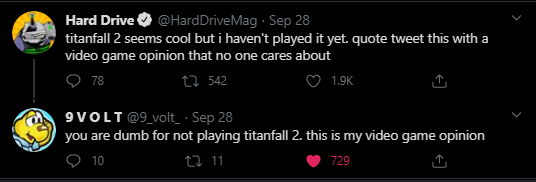 This does not fit the prompt in the original tweet, 9volt. We asked for opinions no one cares about. We care very much about if you think we are dumb or not. If we have to play a video game to change your mind, then god help us, we’ll do it.