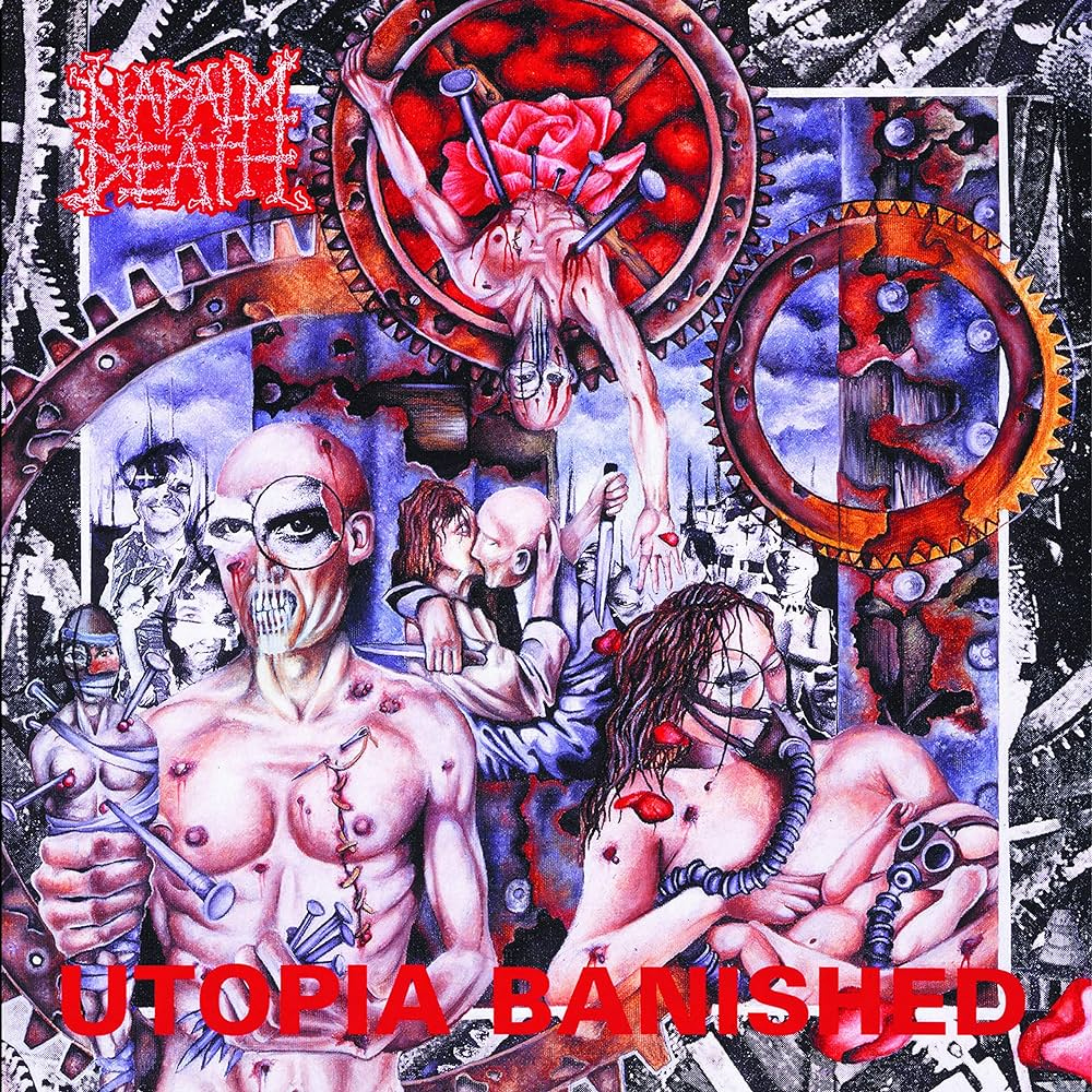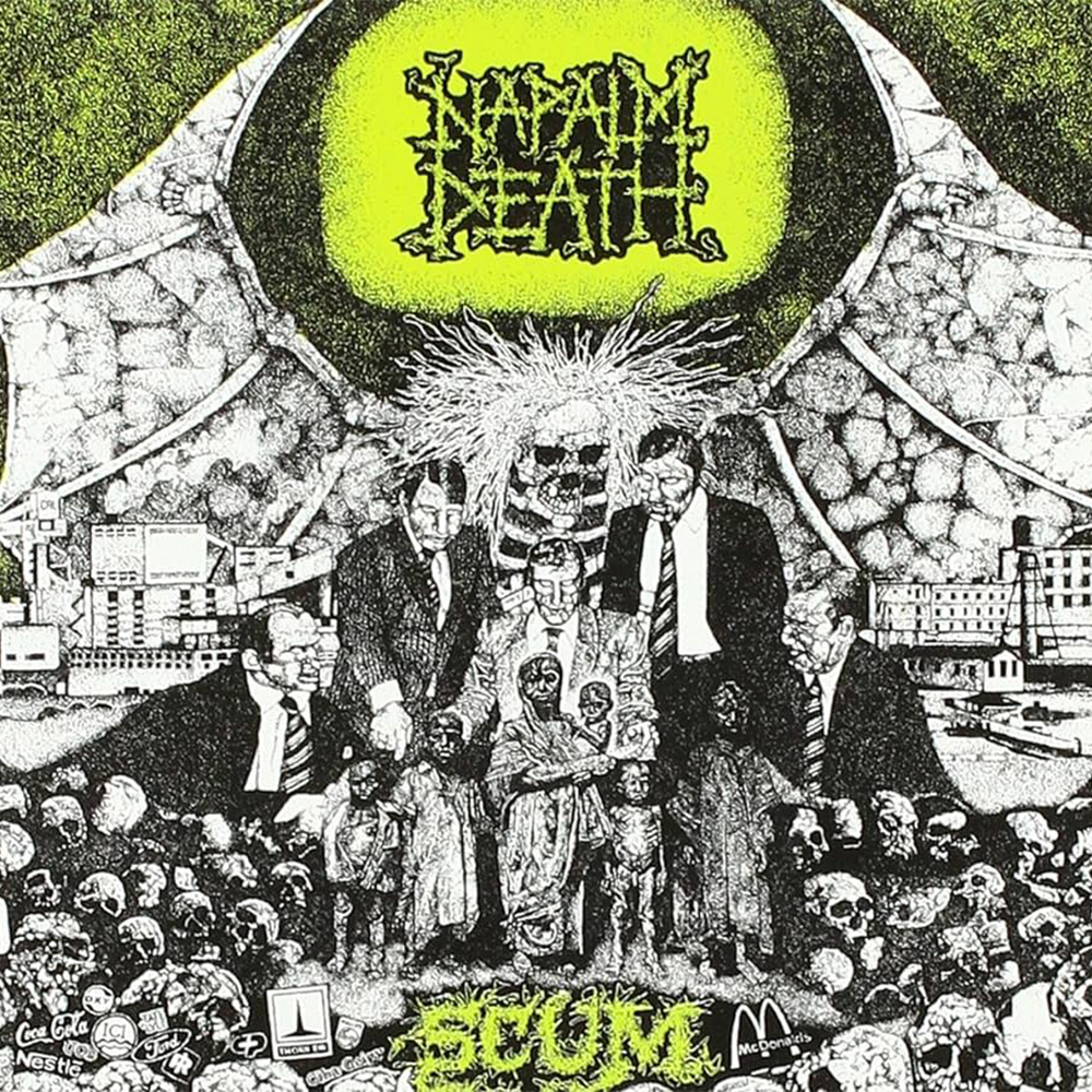 Napalm Death are an influential British grindcore band formed in 1981. Early on, their lineup had some, uh, stability issues, but their most well-known and longest-running one—vocalist Mark “Barney” Greenway, guitarist Mitch Harris, bassist Shane Embury, and drummer Danny Herrera—have made a handful of the best grind records ever. And that’s in spite of having a decade-long identity crisis in the ‘90s that’d make Jason Todd cringe. Their whiplash-inducing, whirling dervish (death)grind is practically a trademark at this point, as is Greenway’s feral bark that sounds like he’s either gargling phlegm or drowning in it. As the primary lyricist, Greenway specializes in trenchant sloganeering such as “Heads to marvel at plastic landscapes / Heads to fill a vacuum of synthesized grace.” Embury, conversely, tends to write, let’s say, more abstractly: “Lucid-inducing swarm / Becoming closer but getting colder / The caustic grip insane.” Indeed, he’s generated enough word salad over his career to end world hunger. But the often-maniacal songwriting is the appeal here, because like a Boeing airplane, these guys have a few screws loose. Let’s appreciate their art of making noise, shall we?