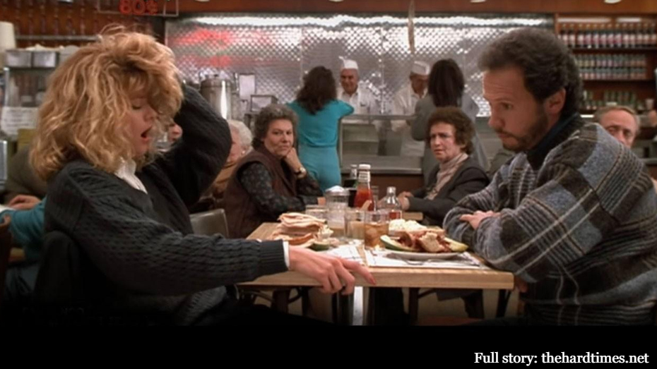 Watching a coworker have a breakdown at work? Witnessing a family member drink themself to death? Just see footage of an international atrocity? Let everyone around know that you’re also not doing great by pointing to whatever awful thing just happened and reciting the classic “When Harry Met Sally” line about orgasms. Inappropriate and concerning!