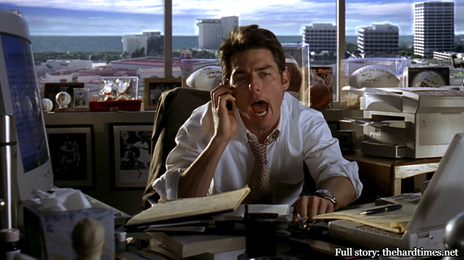 We may “live in a cynical world”, but not every cry for help is due to the weight of existence crushing your insides like an existential hydraulic press. Sometimes you’re just trapped in a never-ending, wage-slave capitalist nightmare. So let your boss know they didn’t have you at hello by screaming this beloved “Jerry Maguire” line before quitting and starting your whole self-destructive cycle over again!