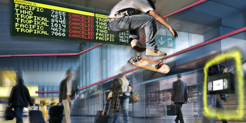 While waiting for this flight, Scott grew bored and skated the airport in his unconventional style.