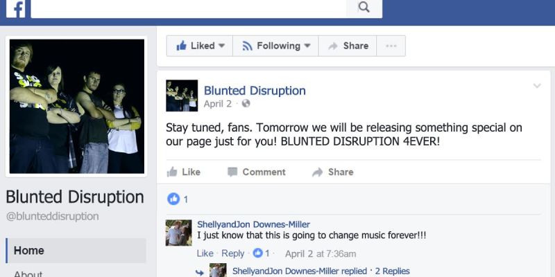 This was Blunted Disruption’s first Facebook activity since December of last year, when the group updated their influences to include Nirvana, the Ramones, and Radiohead. Previously, band interests included only “playing music and having fun,” with their genre listed simply as “rock.” To date, they have released no material whatsoever.