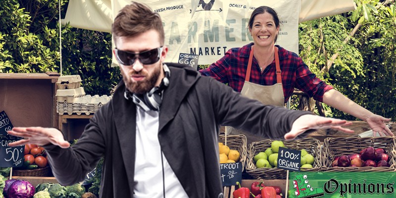 Don’t try and tell me I’m not qualified to DJ a farmers market. Do you see any kind of oversight or regulations of these vendors? I could stroll right in here with some pickled turnips from my basement and no one would blink twice. So what if I play a 45-minute version of “Friend of the Devi,” at least no one will get food poisoning right?